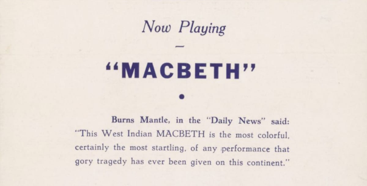 Yet it wasn’t to John Vandercook’s 1928 novel about King Henry, Black Majesty, that Orson Welles looked in trying to find a way to bring Christophe’s story to the stage, but instead to William Shakespeare’s Macbeth. On April 14, 1936, twenty-year old Orson Welles directed his first major play, an adaptation of Macbeth with an all-Black cast. Debuting in Harlem’s storied Lafayette Theatre, the play sold out every one of its 1,223 seats. Ten blocks on either side of the theatre had to be shut down due to the overwhelming crowds, and a police escort was required to lead the ticketed through the throng. Though Welles is perhaps most remembered for directing and starring in the 1941 film, Citizen Kane, which earned nine Academy Award nominations, it was his sensational—and Black—Macbeth that first made him a star.