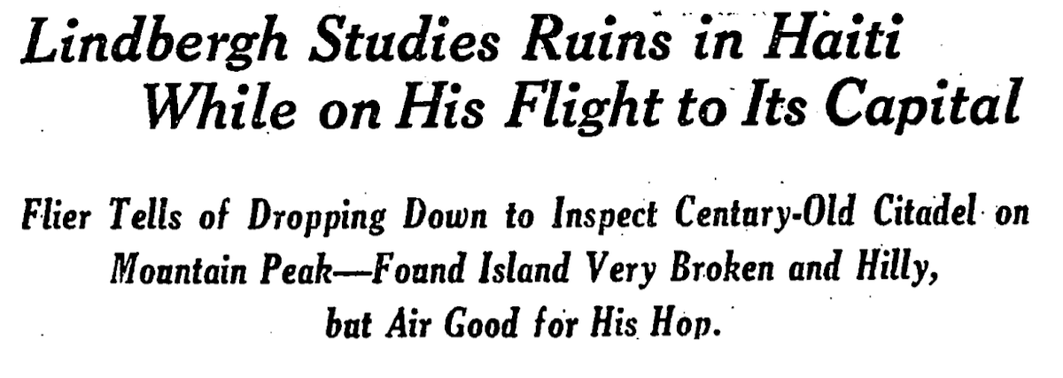 On February 6, 1928, the New York Times published an article written from the city of Port-au-Prince by the famous aviator Colonel Charles Lindbergh. Titled “Lindbergh Studies Ruins in Haiti While on His Flight to Its Capital,” Lindbergh, most famous for having flown the first non-stop transatlantic flight in 1927, described how taking a northwest route from Santo Domingo, he flew over the city of Santiago in the Dominican Republic before heading in the direction of the northern city of Cap-Haïtien. As he circled low over Haiti's former capital, which King Henry Christophe once renamed Cap-Henry after himself, Lindbergh noticed a structure that he had only previously heard of but had never seen with his own eyes: the Citadelle Laferrière, known as the Citadelle Henry under Christophe’s reign.