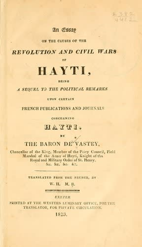 (Title page of 1823 English translation of Baron de Vastey's Essai sur les causes de la révolution et des guerres civiles d'Hayti, originally published in 1819 and the first full-length history of Haiti written by a Haitian)