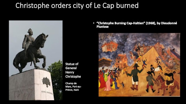 Fighting alongside the famous General Toussaint Louverture, Christophe helped force emancipation of Saint-Domingue’s enslaved population in 1793. The French revolutionary government then abolished slavery throughout the French empire in 1794. However, by 1799, Napoléon Bonaparte had risen to power in France and insisted on restoring slavery. When he sent his brother-in-law General Leclerc to Saint-Domingue for that purpose with 30,000 French troops in early 1802, the French found brigadier-general Christophe, commander over the city of Le Cap, stern, stoic and inflexible. Christophe eventually had the city burned to the ground to prevent French military invasion.