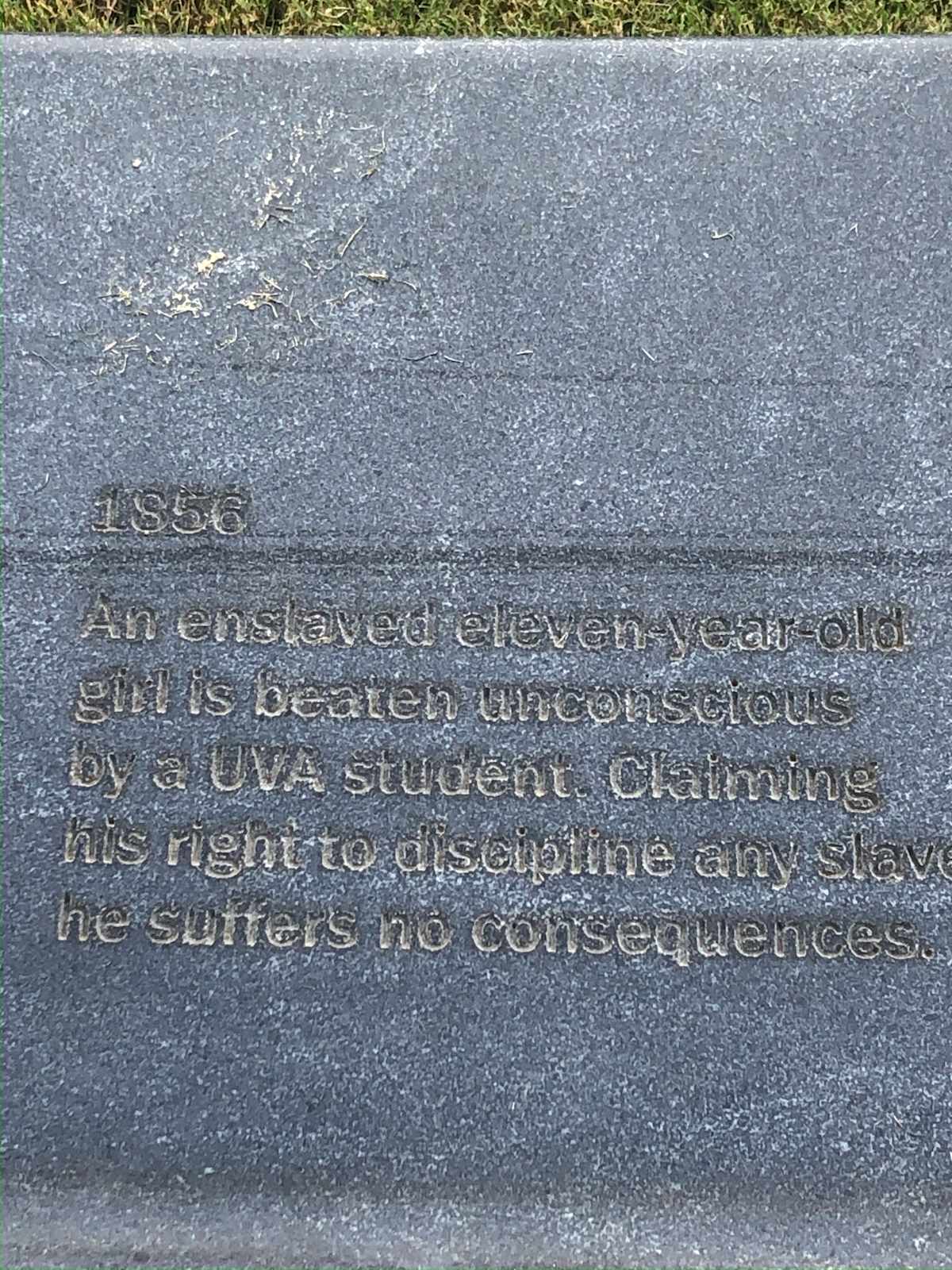 (Testament to the awful terror experienced by an enslaved Black girl beaten by a UVA student, August 2020. Photo Credit: Marlene L. Daut)
