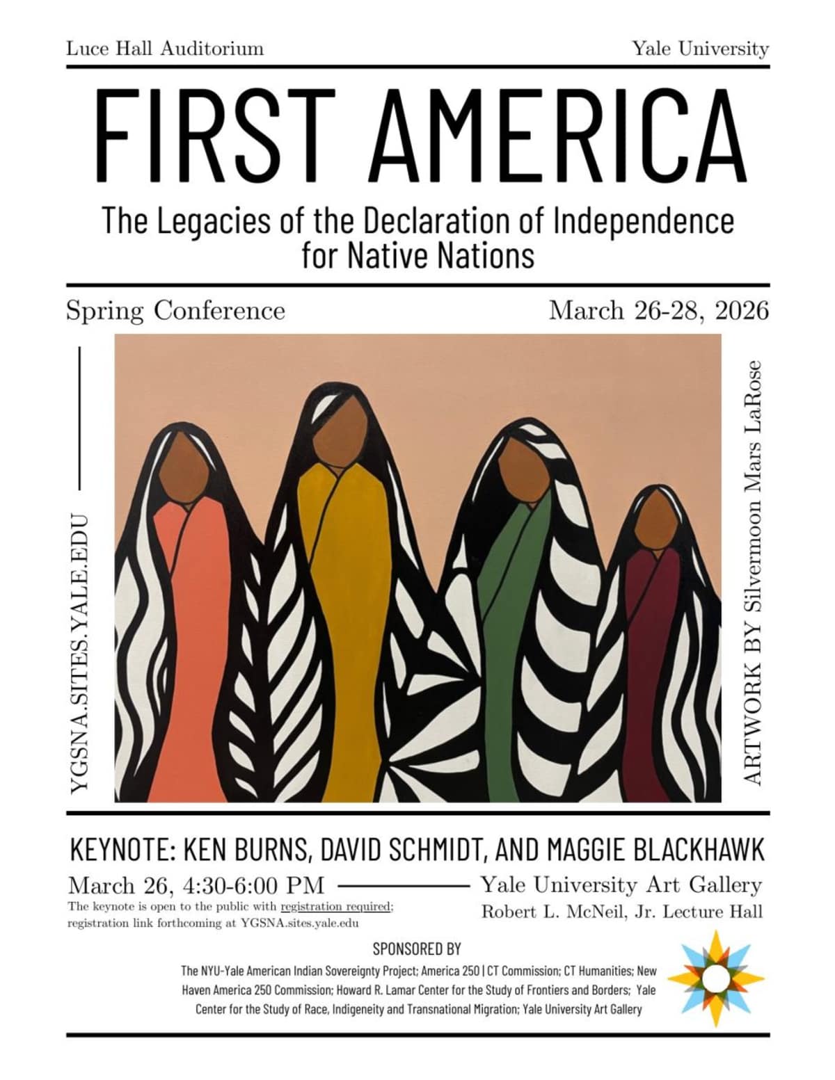 The Yale Group for the Study of Native America (YGSNA) is honored to welcome scholars from across the United States and Canada to New Haven for our spring conference from March 26-28. Entitled “First America: The Legacies of the Declaration of Independence for Native Nations,” this multi-day gathering seeks to explore the myriad ways through which Native American and Indigenous peoples shaped the Age of Revolutions, registering effects that rippled across vast geographies and temporalities – from the signing of the Declaration of Independence to the commemoration of this event today, two hundred and fifty years later.