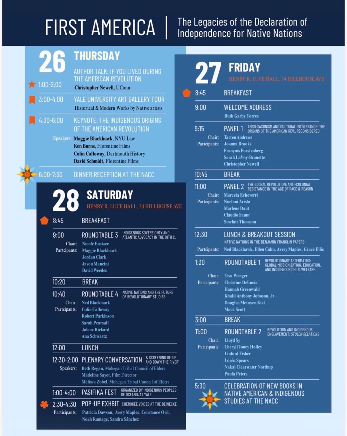 The conference opens on March 26 with a keynote on “The Indigenous Origins of the American Revolution.” From 4:30 to 6:00 at the Yale University Art Gallery in the Robert L. McNeil, Jr. Lecture Hall, filmmakers Ken Burns and David Schmidt, co-directors of the acclaimed PBS Series, “The American Revolution,” will join NYU Professor of Law Maggie Blackhawk and Dartmouth history Professor Colin G. Calloway in conversation. The Lecture Hall will open at 3:45 PM. All registered attendees must arrive at the Yale University Art Gallery (1111 Chapel St) and check in before 4:15 PM on Thursday, March 26. Only after checking in will registered attendees be ushered to the Lecture Hall, where the keynote will take place.