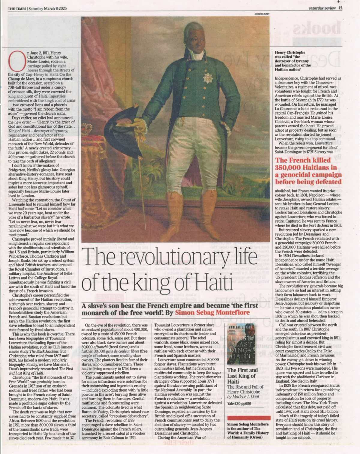 This is why this book is overdue. There have been biographies of Toussaint Louverture, the leading figure of the Haitian revolution, such as CLR James's classic study The Black Jacobins. But Christophe, who ruled from 1807 until 1820, has lacked a modern, scholarly biography. Finally, we have Marlene L Daut's impressively researched The First and Last King of Haiti.